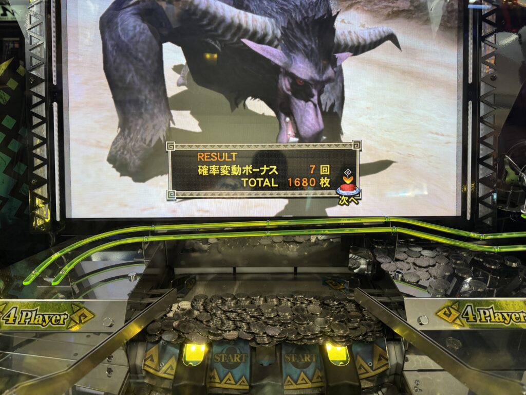 うっかり操作ミスをしてしまい、確変は7回で止まりましたが、トータルで1,680枚のメダルが排出されました❗️