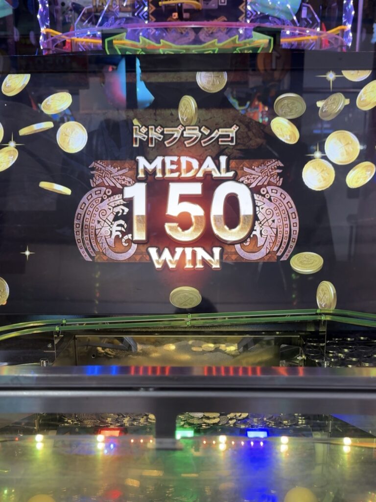 投入したメダルを少しづつズラして落とすゲームのため、実際に獲得したメダルは上記の数ではありませんが、それでも大儲けです❗️
